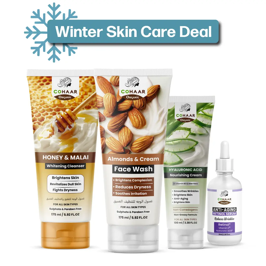 Protect and pamper your skin during the cold months with Cohaar’s Winter Skin Care Deal – a hydrating 4-step skincare combo designed to fight dryness, boost elasticity, and restore glow. Packed with almond, cream, retinol, hyaluronic acid, honey, and malai, this set keeps your skin soft, smooth, and well-moisturized all winter long.